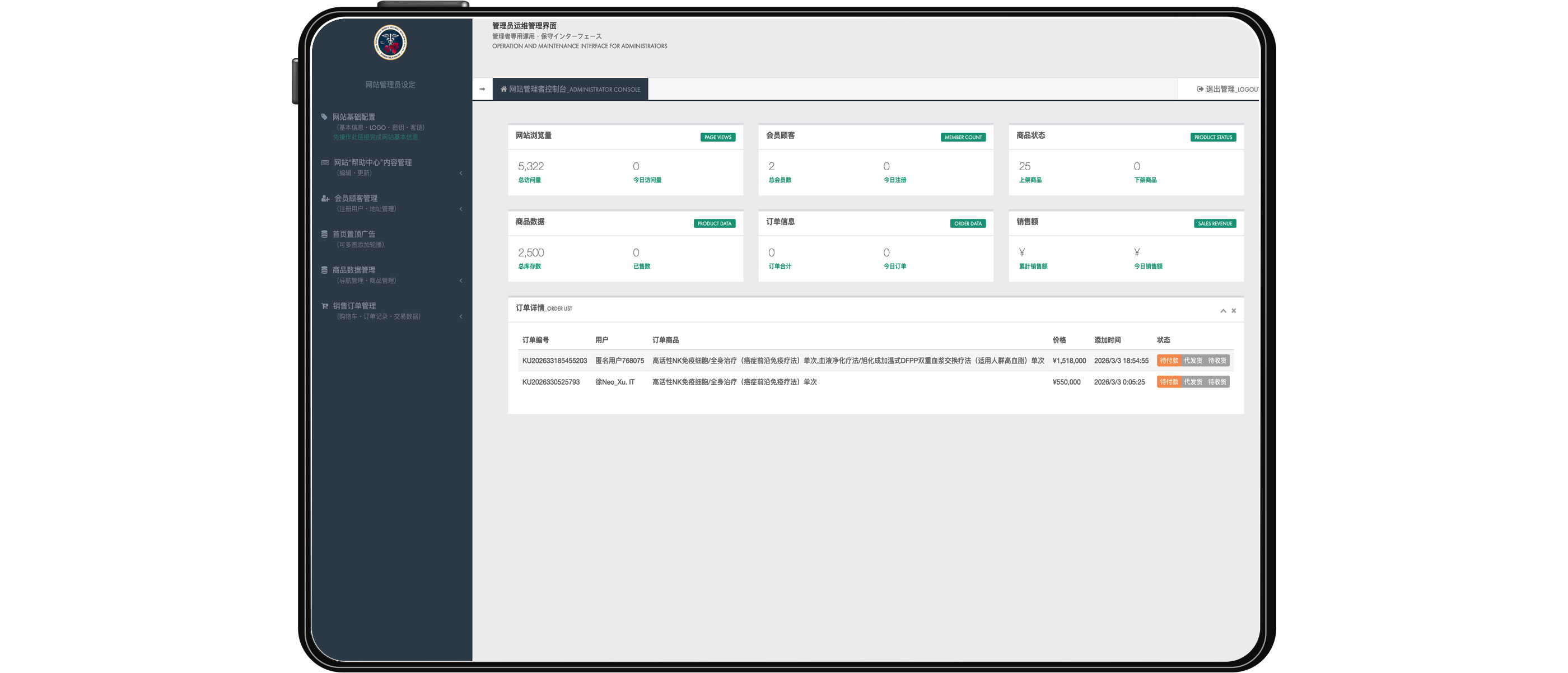 当社のサイト管理用バックエンドシステムは、商品管理・受注管理・顧客管理・在庫管理などを一元化し、効率的な運営を実現するための統合管理プラットフォームです。直感的な操作画面と柔軟なカスタマイズ機能を備え、PCおよびモバイル環境の双方から安全にアクセス可能です。日々の運営業務を効率化し、データ分析を通じて売上向上および業務最適化を強力にサポートいたします。